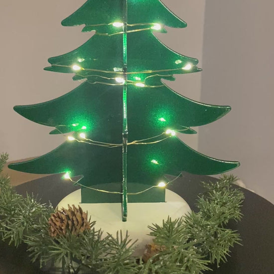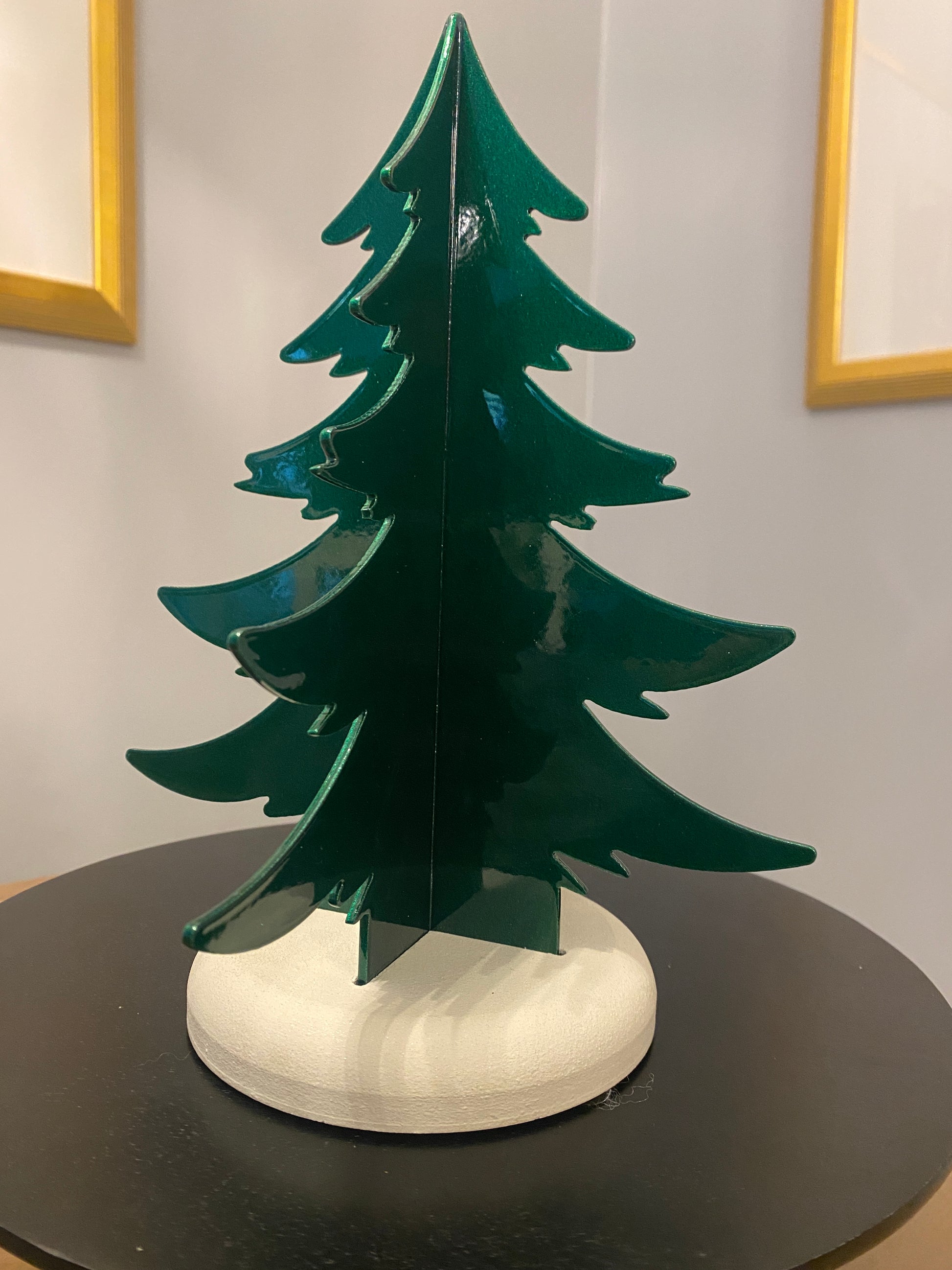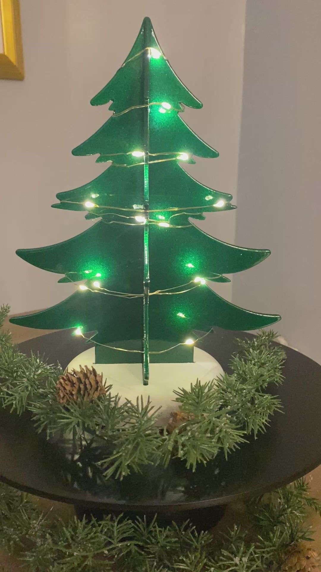 Add some shimmer, sparkle, and charm to your holiday decor with this handcrafted metal Christmas Tree. Made from sturdy powder-coated steel and mounted on a painted wooden base with a subtle glitter finish, this freestanding tree blends modern simplicity with a festive touch. The deep green powder coat glows under holiday lights while the glittered base reflects a soft, snowy sparkle, creating the perfect accent for mantels, tabletops, shelves, or entryway displays.