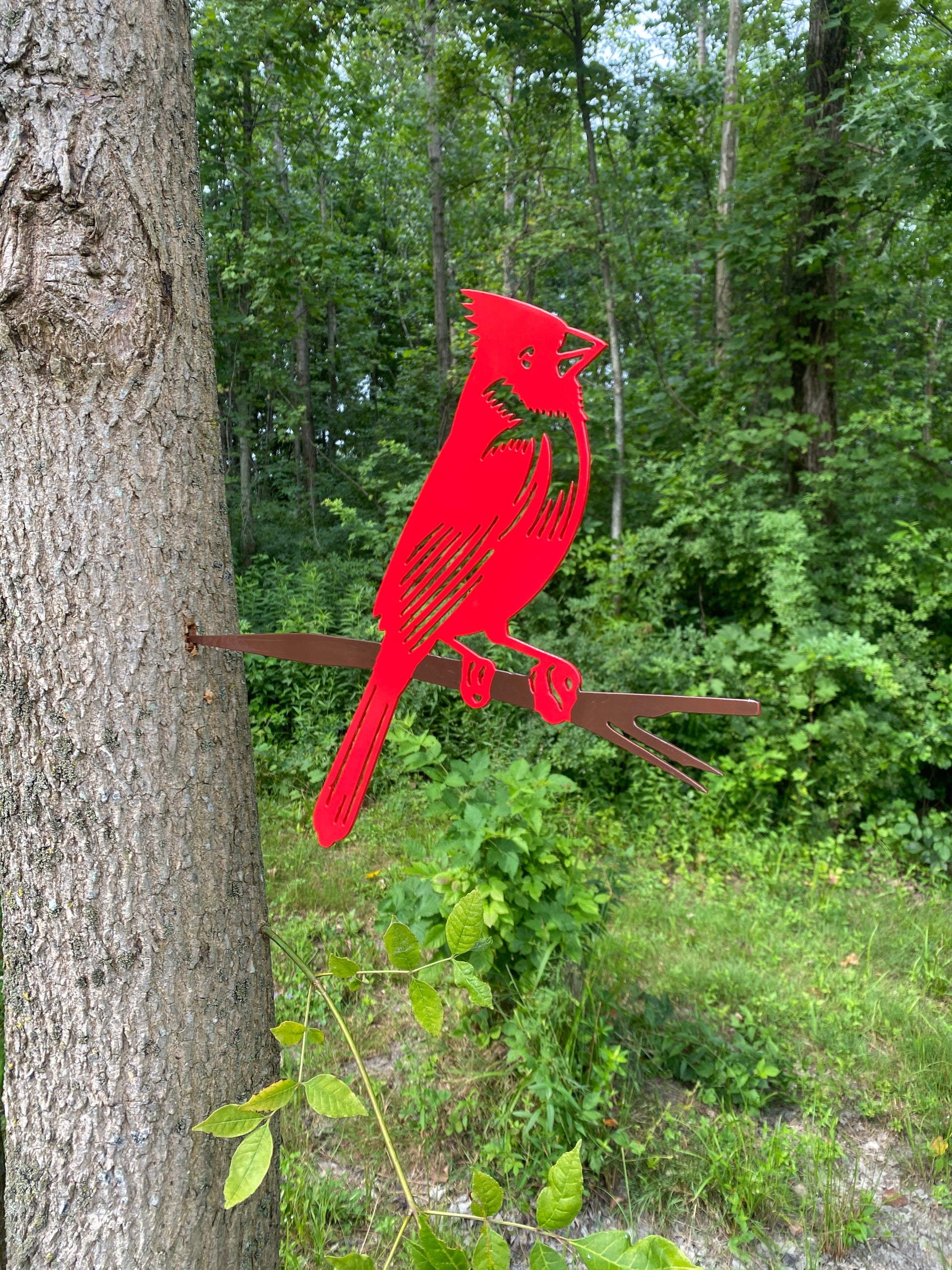 Bring the vibrant beauty of nature to your outdoor space with our Metal Cardinal Tree Stake. Crafted from durable steel and finished with a bold, weather-resistant red powder coating, this striking bird silhouette perches on a brown “branch” stake.