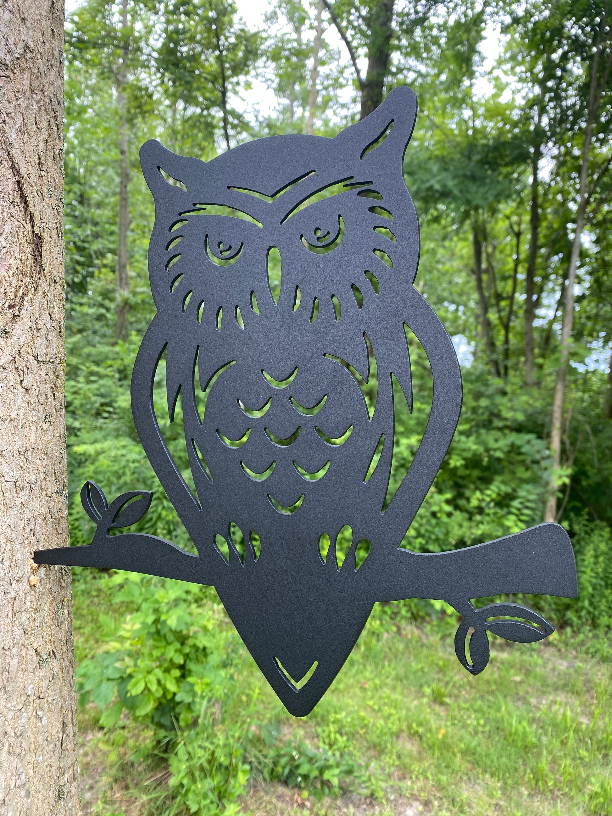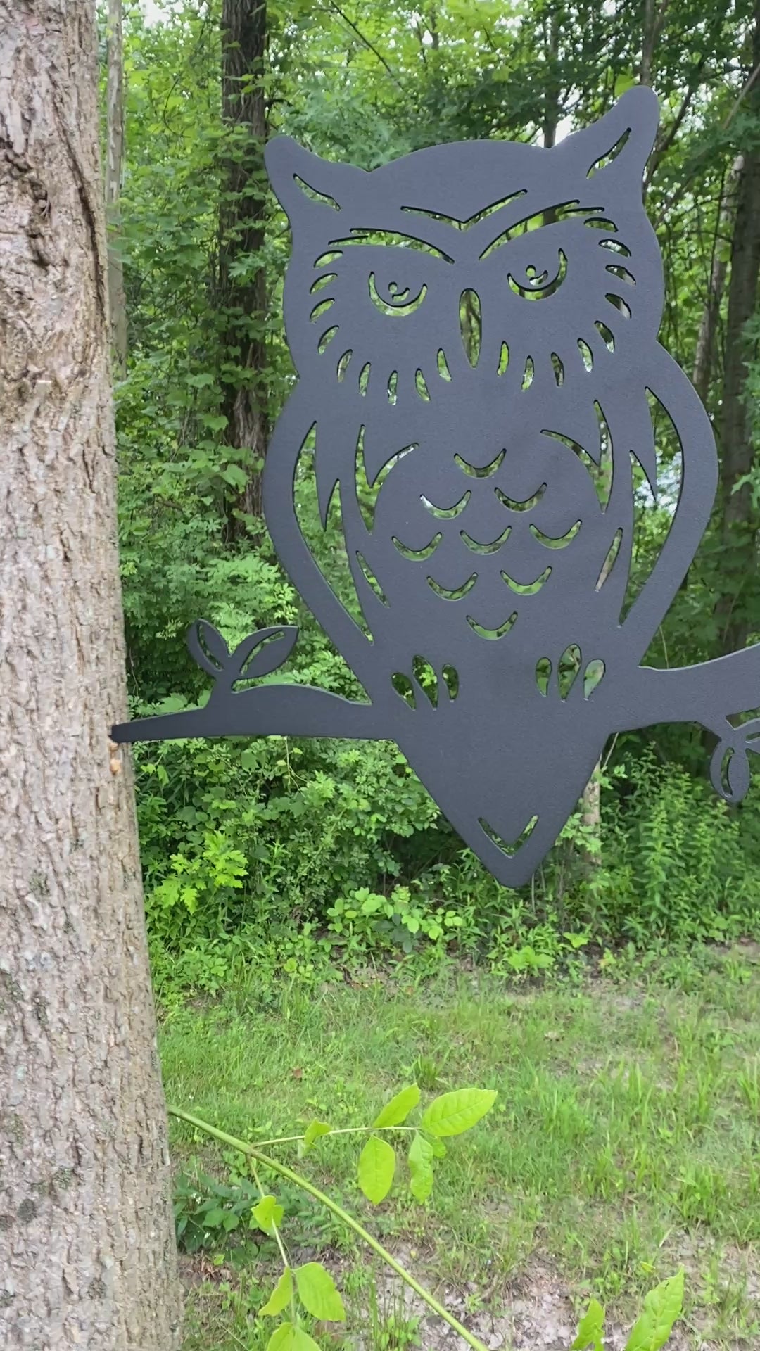Bring wisdom and charm to your outdoor space with this handcrafted metal owl tree decor. CNC-cut from durable steel and finished with a weather-resistant powder coat, this owl perches gracefully on a branch, making it a perfect addition to your yard, garden, fence, or woodland setting. A wonderful gift for bird lovers, owl collectors, a housewarming gift, or a unique Christmas gift.